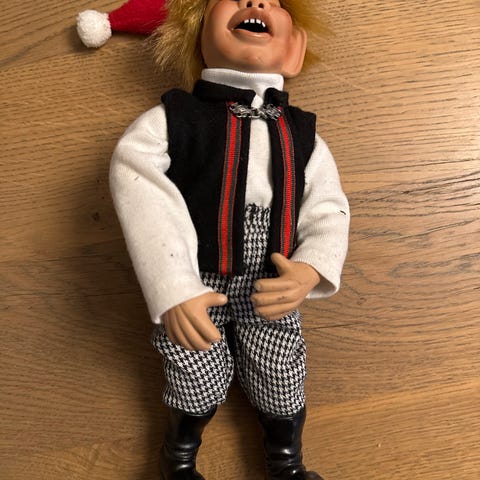På grunn av flytting må jeg selge denne fine karen med fela si. Veldig forseggjort og håndlagd nikkers, skjorte, vest og lue med mange fine detaljer. Ansiktet er uttrykksfullt utført med fantastisk fine øyne. Dette er kvalitet, lagd av en flink dame i Ålesund. Den er 50 cm høy og stativ følger med. Håper noen har interesse, da den er for fin til å bli stuet bort. Lagde den kun til meg, finnes ingen flere. Unik.