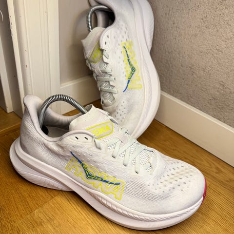 Hoka løpesko i størrelse 42 som ble brukt bare én gang under Chicago maraton. Jeg gikk dog halvparten av maratonen så har de ca. 20km løping og 22km gåing inn i seg.