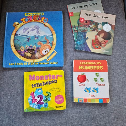 Bøkene er I tykk papp, pekebøker med klare, fine bilder. Litt tekst.