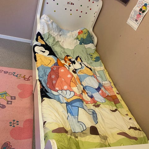 Juniorseng i hvitmalt tre (ordentlig tre, ikke plastbelagt spon). Stabil og fin seng brukt av flere barn, så den har noen bruksmerker. Noen hakk og sår i malingen.