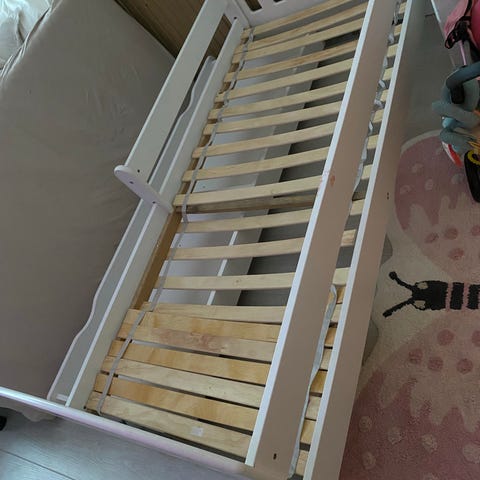 IKEA juniorseng i metall med hvit farge. Egnet for barn, designet for å gi støtte og komfort i junioralder. Må hentes. Madrassen trenger vask.