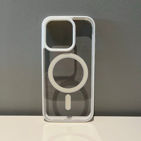 Gjennomsiktig MagSafe deksel med svart ramme til iPhone 15 Plus selges.