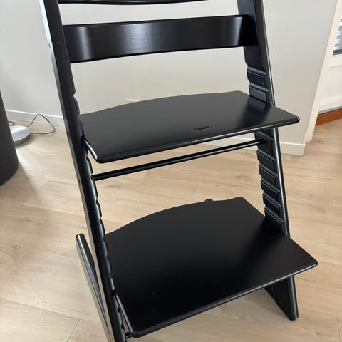 Stokke Tripp Trapp høy barnestol i tre. Justerbar sitte- og fotplate for tilpasning til barnets vekst. Designet for bruk ved spisebordet for barn i ulike aldre. Enkelte bruksmerker.