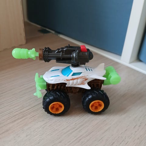 Monster trucken lager lyd og lysere når man trykker på motoren foran svinger når man bøyer den fra side til side og er det gøy for barn på rundt tre år