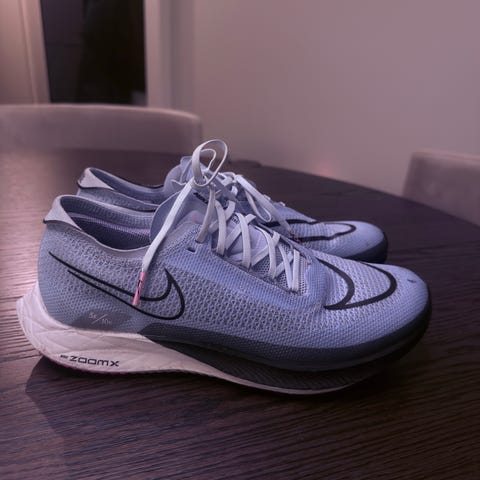 Nike Zoom Victory 3 løpesko i størrelse 39. Skoene er blå og designet for løping, med pigger under for bedre feste og ytelse på bane. Materialet gir god ventilasjon og komfort under aktivitet.