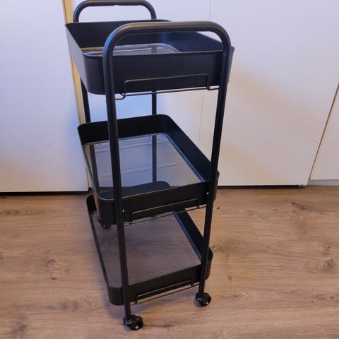 IKEA RÅSKOG oppbevaringsvogn med tre nivåer, laget av svart metall med perforerte hyller. Vognen har hjul for enkel flytting og maksimal belastning på 6 kg per hylle. Mål: 45 cm bredde, 35 cm dybde, 78 cm høyde.