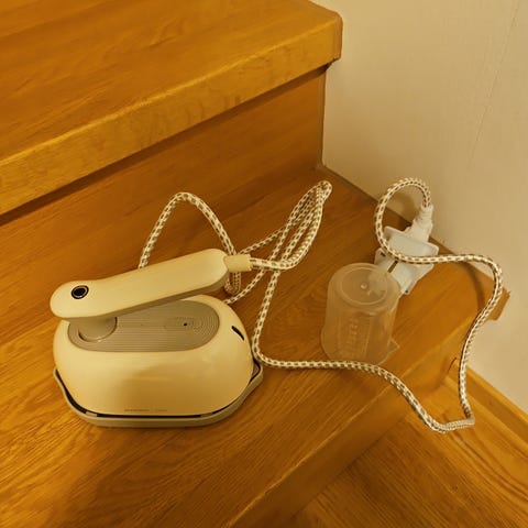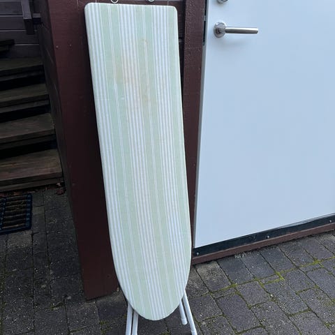 Bra strykebrett fra Rørets med trekk. Maks høyde 89, bredde 33 og lengde 110 cm. Nypris 419 + trekk 100.