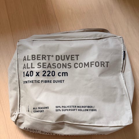 Albert dyne i 200x220 cm - dobbeltdyne selges. Den er brukt to ganger - men blir for varm for meg dessverre. Følger med et sett bomulls sengetøy i 200x220 cm fra kid. Og et dynetrekk i hvitt (uten putetrekk).