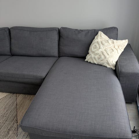 Stor sofa fra Bohus selges. Den er godt brukt, men fortsatt fast i putene og har mye bruk igjen. Noen av ryggputene er solbleket og det er en løs tråd i en pute, se bilde. Puff følger med. 250*320*165. Dybde 85.