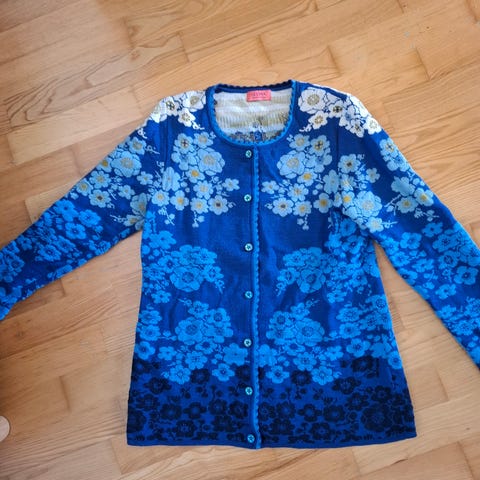 Selger en flott Oleana cardigan i mønsterstrikk med glidelås i front. Kort modell med lange ermer og rund hals. Veldig fin kvalitet i ull/silke og passer like godt til jeans som over kjole/skjørt.