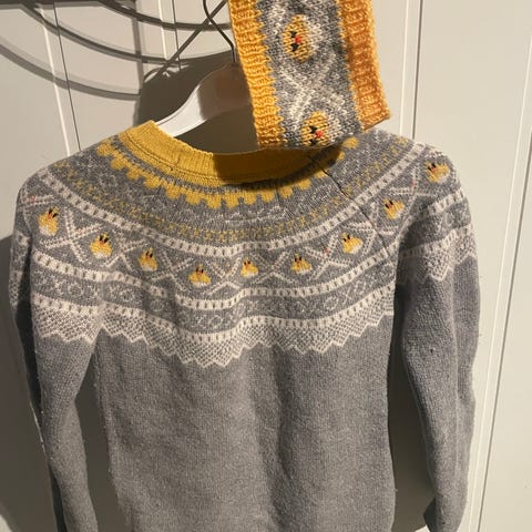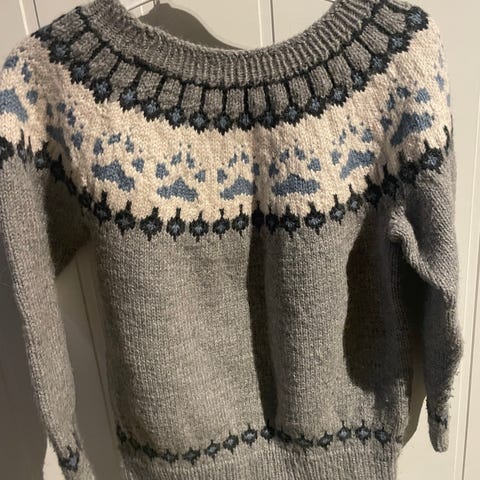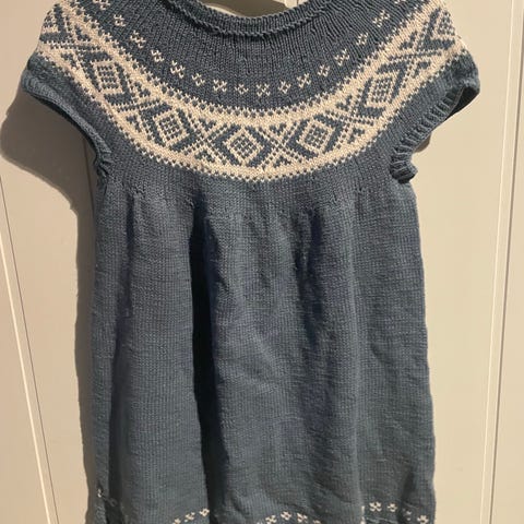 Hjemmestyikket rød og hvit. Vi brukte den som julekjole. Ca str 8-20 år.