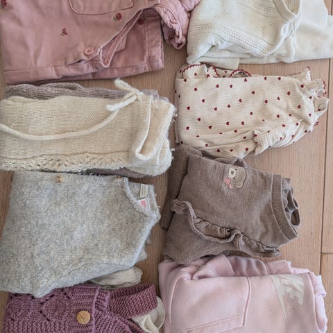 En pakke med stort sett bare ull. Hjemmestrikket og fabrikklaget. Noe er litt mer slitt enn annet, men alt er mye bruk igjen. Det som er hjemmestrikket er litt vanskelig å si størrelse på, men det er ikke mindre enn 74, heller større, noe å vokse i.
