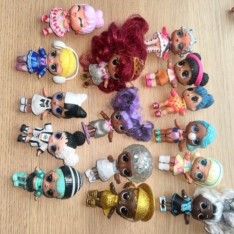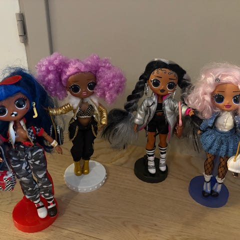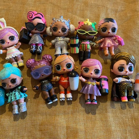 L.O.L. Surprise dukker med forskjellige utseender og tilbehør. Inkluderer flere små dukker og diverse tilbehør som klær, hatter, sko og andre små gjenstander. Passer for barn som leker med samledukker og tilbehør.