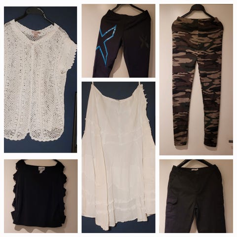 Selges billig for å få det unna. 2 skjørt, 5 bukser, 3 gensere, 1 skjorte, 6 topper/t-skjorter/singleter, 3 shorts, 1 kjole.