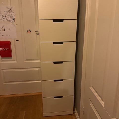 IKEA malm kommode (smal, 40 cm bred) med seks skuffer selges. Den har speil i lokket i toppen. Kommoden er lite brukt, ser ut som ny, uten synlige bruksmerker.