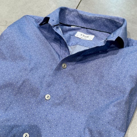 Eton skjort str 39 / 15 1/2 slim. Blå og hvit. Fremstår i veldig god stod, nesten ikke brukt. Selges fordi den ikke blir brukt.