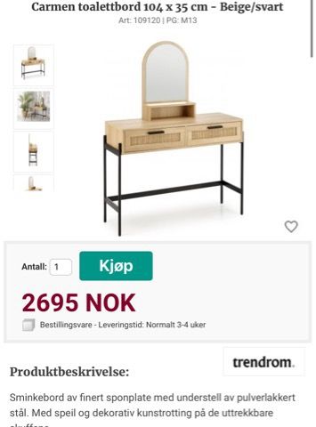 Kjøpt fra importpris til kr2399, https://www.importpris.no/products/sminkebord-lucia-med-led-lys-og-sensor?gad_source=1&gad_campaignid=23180984573&gclid=CjwKCAiAzOXMBhASEiwAe14SaTdgIMzIrfiRN_XCIg03REIcVP4d6bMyAiF_eBKF-Hm1AJKbtZHPeRoCoGwQAvD_BwE selger fordig datteren min har fått nytt sminkebord må hentes .