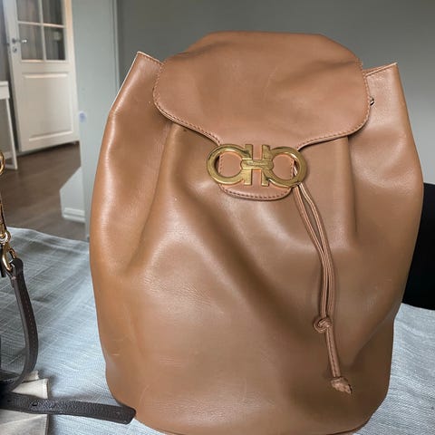 Miu Miu ryggsekk (den største str) med justerbare skulderstropper og flere lommer. Materialet er stoff med detaljer i lær.