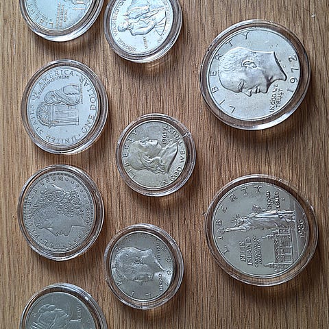 Sølvdollars selges.2 stk.One Dollar a kr:650,-og 6 stk.Quarter dollars a kr.200,-