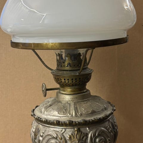 Gammel olje/parafin lykt/lampe i messing/bronse siselerte glass