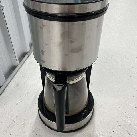 Sandstrøm kaffetrakter med vannbeholder, digitalt display og knappkontroll. Maskinen har en glasskanne og et synlig vannivåindikator på siden. Designet i rustfritt stål og svart plast.