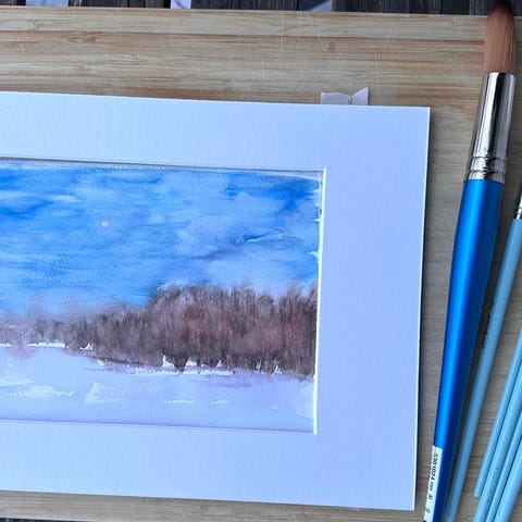 Akvarell som viser et vinterlandskap med himmel og trær. Bruk av blå, lilla og hvite nyanser for å skape en stemningsfull naturillustrasjon.