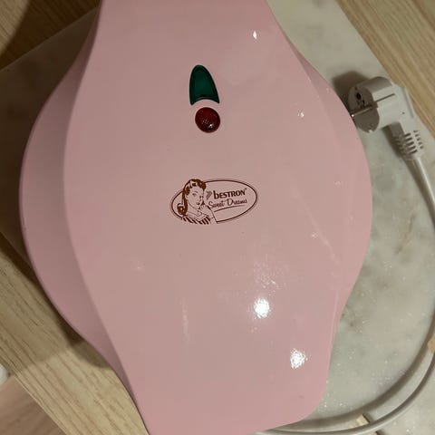 Et pent brukt rosa vaffeljern som steker belgiske hjerter. Jernet har non-stick belegg og indikatorlys. Det er dessverre en liten del på baksiden som er knekt, men det påvirker ikke bruken av jernet. Jeg har selv stekt vaflene uten pinner.