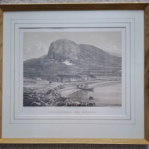 Pent innrammet med passepartout, antirefleksglass og ramme i gullfarge. 38x32 cm. Tekst på baksiden er skrevet av Peter Christen Asbjørnsen.