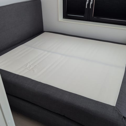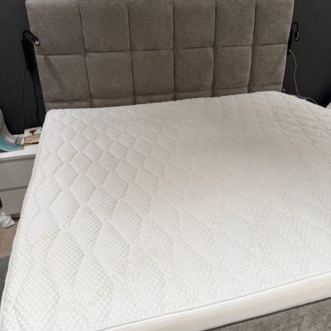 Hel og god seng, men litt nupper i stoffet på siden. Kan sikkert fjernes med nuppefjerner.
