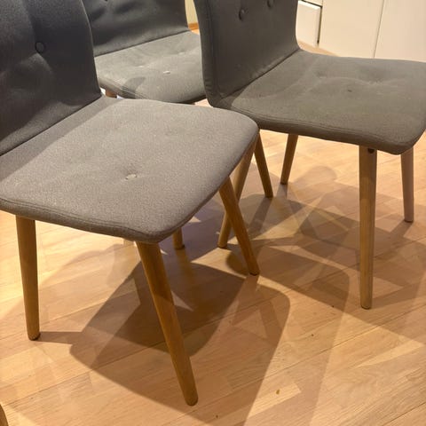 Fire spisestoler gis bort ved henting. Her er det kun tatt bilde av den ene. Det er ikke til å legge skjul på at de er godt brukt. De er gode å sitte på. Kan bli fine med litt fiksing. Trekke om stoff og fikse puten i setet på en av stolene, den gir litt for mye etter.