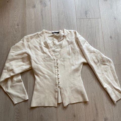 Cardigan fra Gina Tricot. Aldri brukt og er i perfekt stand. Størrelse S for kvinner, cardiganen har knappestolpe foran og er hvit i fargen.