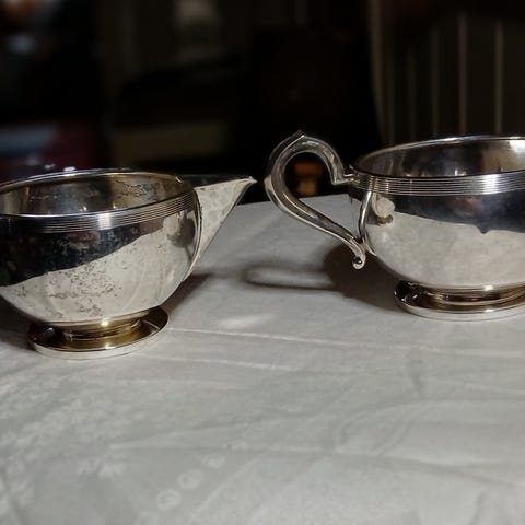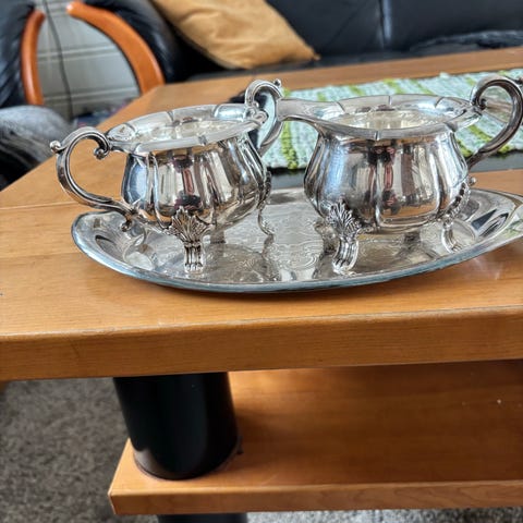 Søkeord: 830S sølv, 830 sølv, fløtesett, fløtemugge, sukkerskål, norsk sølv, vintage sølv, antikk sølv, serveringssett, sølvtøy.