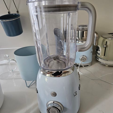 Smeg blender i lyseblå farge. Inneholder glasskanne med håndtak og lokk. Utstyrt med start/stopp-knapp og justerbar hastighetskontroll. Designet for bruk i kjøkken til blanding av ingredienser.
