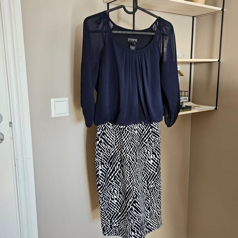 Stilig kjole. .Kvaletet stilen kjoler. Farge.hvit.mørke på toppen. Ny bomull strech rett skjørt av Farge: sort med hvite prikker. Det finnes en skjult glidelås i bak og liten splitt..
