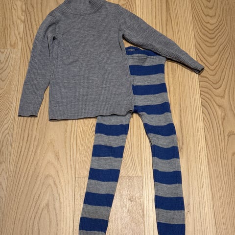 Safa strikkasett str. 120 (virker romslig), med mulighet for å klippe ned kanten og forlenge buksebena så dette er ett sett som vokser med barnet og varer lenge.