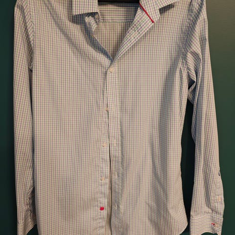 Linskjorte fra Dressmann har kort arm, resten er langermet. Skjorten fra Gsus Industries har noe slitasje i fargen på knappene, ellers er det ingen slitasje/bruksmerker på skjortene.