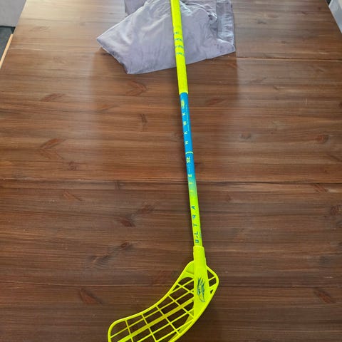 TK innebandyblad i plast med blå detaljer og tilhørende innebandyball med hull. Produktet er egnet for innebandyspill.
