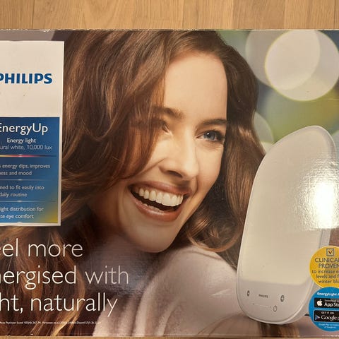 Selger en Philips EnergyUp HF3419 lysterapilampe i god stand. Lampen gir et sterkt, dagslyslignende og UV-fritt lys og er fin å bruke i mørke perioder for mer energi og bedre velvære.