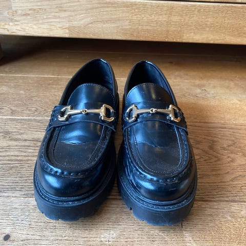 H&M mokkasiner i størrelse 37. Skoene er svarte med dekorative metallspenner foran. Klassisk utseende.