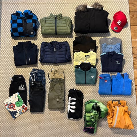 # nøytral pakke med gutteklær barneklær sommerpakke sommer vår sommertøy joggesett sett nøytrale farger jordfarger jordtoner 116-122 zara newbie polarn o pyret pop pdl