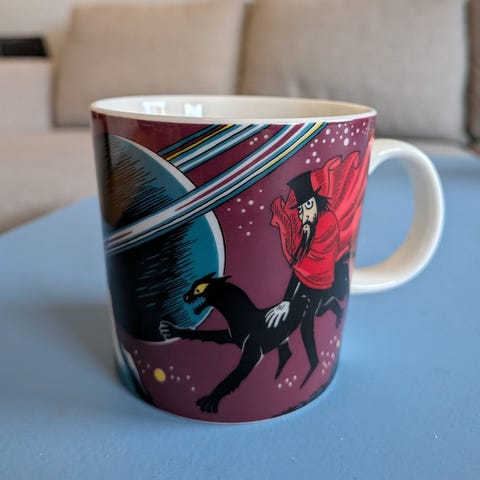 Arabia The Hobgoblin kopp med illustrasjon inspirert av Mummitrollet. Koppen har et fargerikt motiv med karakterer og nattlandskap. Laget i keramikk med hank.