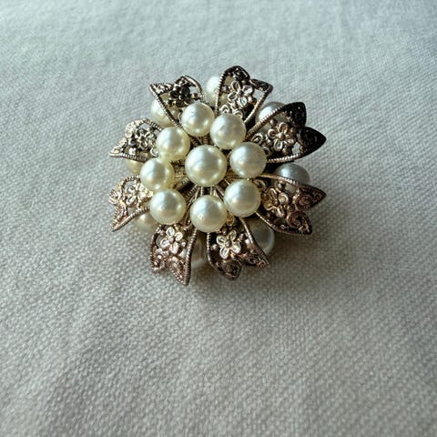 Brosje med perlemor og metall. 5,3 x 4,6 cm.