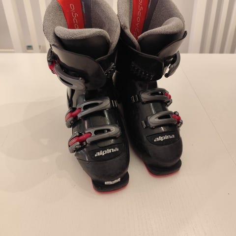 Størrelse ca 33. Alpina slalåmstøvler i svart farge med røde detaljer. Støvlene har fire spenner. 244 mm. Nylig kjøpt brukt, selges fordi vi trodde det var to størrelser større.