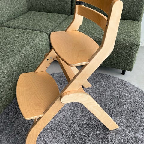 Kiddo Høy barnestol i svart tre. Designet for barn, gir støtte og komfort ved spisebordet. Justerbar sitte- og fotplate for tilpasning til barnets vekst. Tripptrapp stol.