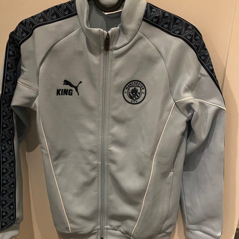 Puma Manchester City fotball treningsdress for barn i størrelse 152. Dressen består av jakke i lyseblått med hvite detaljer og bukse i mørkeblått. Laget egnet for fotballaktiviteter. Kjøpt på Istanbul Grand Basar
