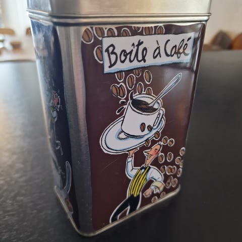 Selger lite brukt kaffeboks fra Derriere la porte for 40 kr. Liten bulk i lokket- se bilde og så buler den såvidt inn foran- se bilde. Nesten ikke synlig. Ellers pen og god som ny.
