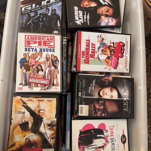 Pakke med 40 DVD-filmer som inkluderer titler som The Bourne Supremacy, Borat, The Bourne Identity, og flere andre. Filmer i forskjellige sjangre som action og komedie. Format: DVD. Selges samlet 100kr