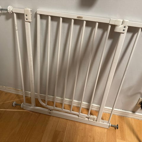 Barnegrind i metall. Laget for å sikre områder for barn ved å hindre tilgang. Justerbar bredde for tilpasning til ulike døråpninger eller trapper.