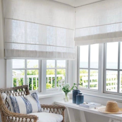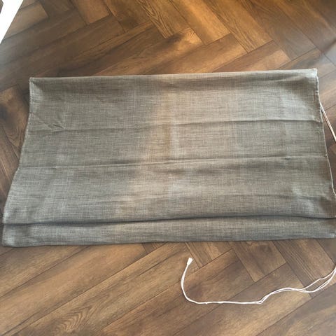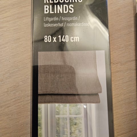 Kid Aino Liftgardin laget av blått stoff. Passer til vinduer og gir mulighet for justering av lysmengde ved hjelp av snor.