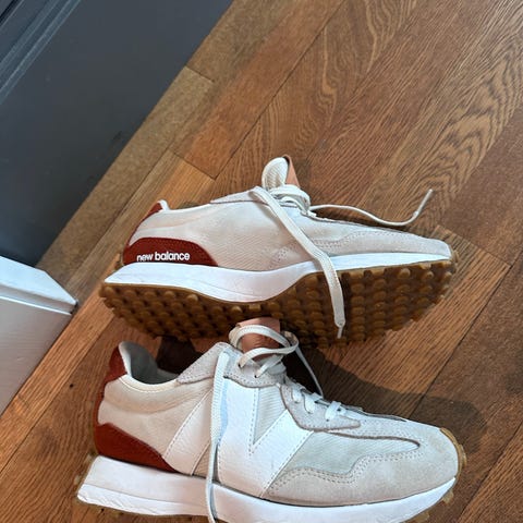 Selger et par stilrene og ubrukte New Balance sneakers i grønn semsket skinn med hvite detaljer. Klassisk og tidløst design som passer like godt til hverdags som til pent.